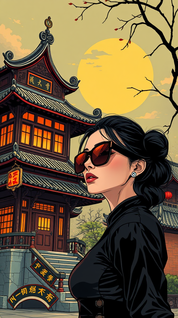 A futuristic woman in sleek sunglasses stands next to a vintage Chinese house, set in a cyberpunk manga world. The scene features a blend of Ross Tran's vibrant style and traditional Chinese iconography, with a palette dominated by dark black and light amber. Bold graphic illustrations capture the essence of Chinese tradition amidst a backdrop of multi-layered color fields. The atmosphere is a harmonious fusion of past and future, with intricate details and a high stylization reflecting the spirit of an ever-evolving cultural landscape.