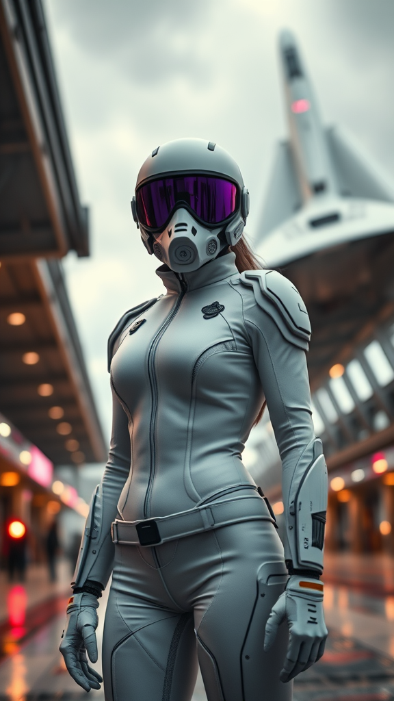 A futuristic woman stands poised in a form-fitting white jumpsuit at a bustling spaceport, while a sleek spaceship roars into the overcast sky behind her. Her eyes are shielded by a reflective purple sci-fi visor mask, complemented by an intricately designed respirator and armor plates that suggest strength and resilience. Viewed from a low angle, the scene envelops her in a cinematic aura, the fine details of her suit and gear sharply rendered against the natural textures and realistic blur of the background. Soft, moody lighting enhances the photorealism, casting a sophisticated, futuristic ambiance. The environment echoes the highest quality of cinematic sci-fi, with ray tracing capturing the interplay of natural light. This 8K ultra-HD depiction blends elements of CGI and real-world photography, highlighting the precise, intricately crafted aesthetics of a sci-fi movie, with subtle creative twists embellishing the background with dynamic, immersive imagery.