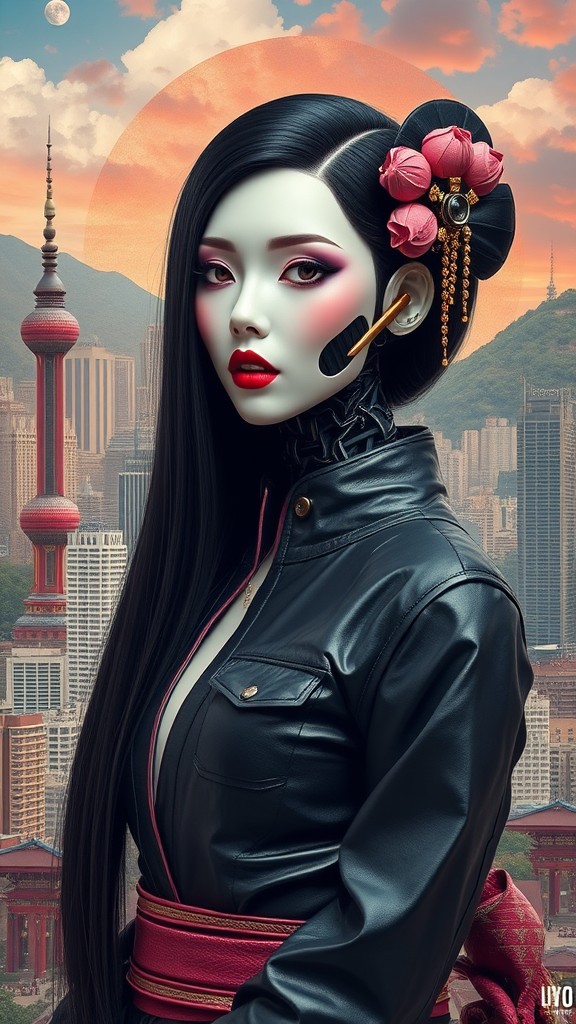 A futuristic woman with a robotic geisha face featuring delicate porcelain skin, adorned with long, sharp, golden fangs, merges seamlessly with her human body. Her sleek, black hair cascades down her back, complimented by subtle pink accents that add a touch of whimsy. She wears avant-garde leather fashion that melds traditional elegance with modern edginess. The background is a kaleidoscope of diverse landscapes, blending urban cityscapes with serene natural vistas, creating a harmonious yet contrasting setting.