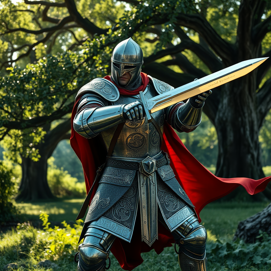 A gallant medieval knight in full body armor, wielding a mighty longsword with precision, exhibiting an ultra-detailed design and high realism, set in a lush, verdant landscape. The armor is intricately engraved with mythical symbols, gleaming under a soft, dappled sunlight that filters through ancient oaks. The knight's poised stance reflects an aura of noble determination, while a gentle breeze causes their crimson cloak to billow behind. The scene captures the essence of a bygone era, invoking a sense of timeless bravery and valor.