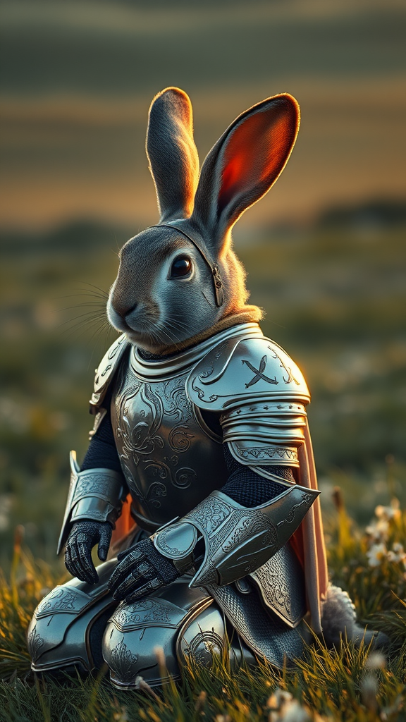 A gallant rabbit knight, kneeling in a serene meadow, donned in intricately designed armor that gleams with the luster of silver under the cinematic lighting. The armor is adorned with delicate engravings, and accents of shimmering silk weave through the design, adding an air of nobility. The knight's ears stand tall, reflecting both alertness and grace, as the setting sun casts a golden halo around its form, captured in stunning 4k detail.