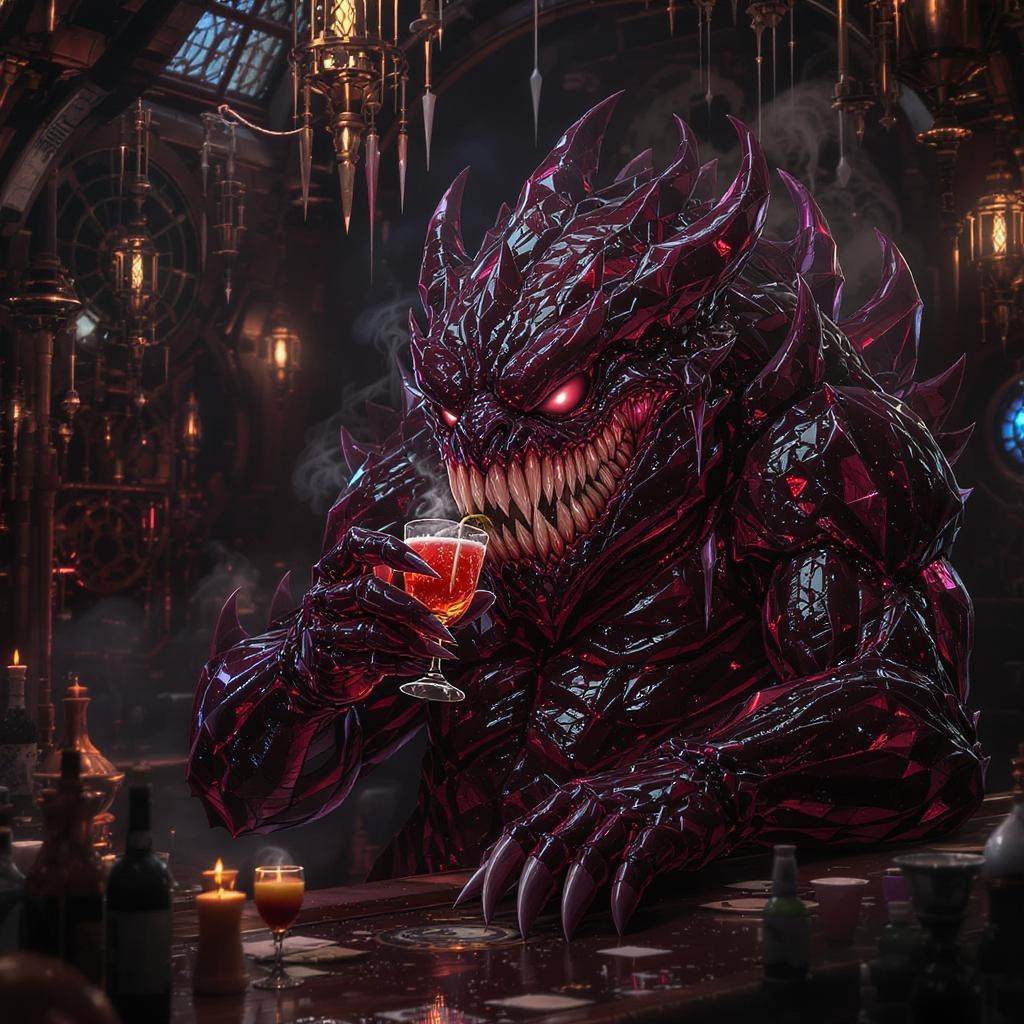 A gargantuan garnet creature savoring a drink in a dimly lit bar, its wet, crystalline surfaces reflecting ambient light in a steampunk-inspired setting, captured in a strikingly realistic photograph with luminescent accents, hyper-detailed textures, and a sharp cinematic focus. The creature is rendered in high-resolution 3D with Octane, highlighted by artful rim lighting. This intricate scene is trending on ArtStation, featuring an isometric view that is perfectly centered, enhanced by delicate bokeh and a mesmerising depth of field.