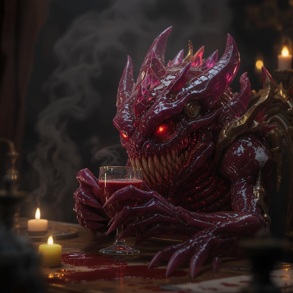 A garnet-hued creature sipping a drink in a dimly lit tavern, its luminescent surface reflecting the ambient light, captured in a breathtakingly realistic photograph. The creature's wet, crystalline structure is reminiscent of intricate steampunk designs, rendered in stunning 3D with Octane Render. The scene is meticulously detailed, with sharp focus highlighting each facet and curve of the creature's form. The composition is cinematic, featuring rim lighting that accentuates the monster's unique texture. The isometric perspective centers the creature within the frame, surrounded by a soft bokeh effect that creates depth and immersion, reminiscent of trending art on ArtStation.