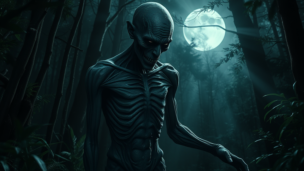 A gaunt and sinister figure lurks in the dense forest, a spectral being exuding an air of dread and malevolence, eerie and supernatural, wrapped in shadow and intricate details, its skin a tapestry of veins and decay, illuminated by shafts of dramatic moonlight, lifelike and hauntingly vivid, as if pulled from the depths of a chilling cinematic nightmare, ultra-high definition.
