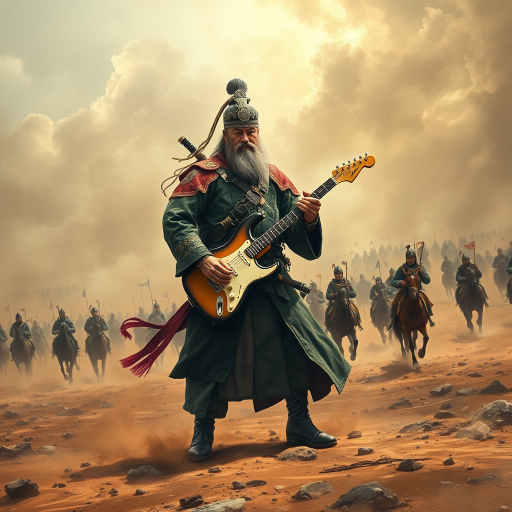 A general of the Qin Dynasty stands resolute in the middle of an expansive battlefield, gripping an electric guitar with intensity. The landscape is enveloped in swirling dust and smoke, creating an aura of mystique and tension. In the background, an army on horseback charges forward, their silhouettes stark against the smoky sky. The scene captures a blend of ancient strength and modern rebellion, painted in vivid, hyper-realistic detail, with a panoramic view that highlights the vastness of the battlefield and the drama of the moment.