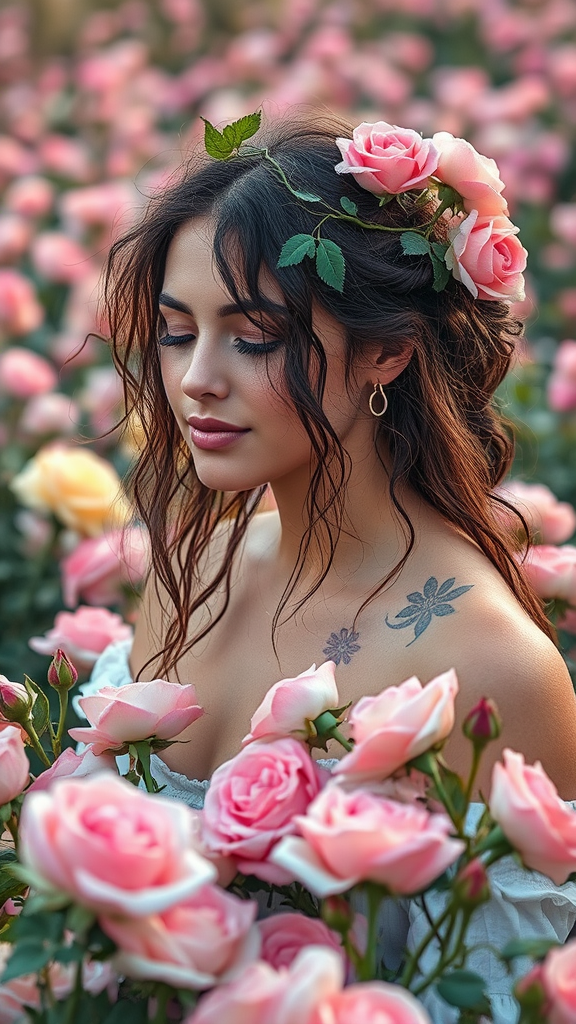A gentle botanical mystic with vines as hair styled in loose, organic waves resting on her shoulders, radiating warmth in a field of sun-kissed pastel roses, the color palette rippled with vibrant hues reminiscent of hinduist mythology - divine florals intertwined with delicate strokes of rural store book spines weathered old - earthen tones and alluring galaxie palette shots.