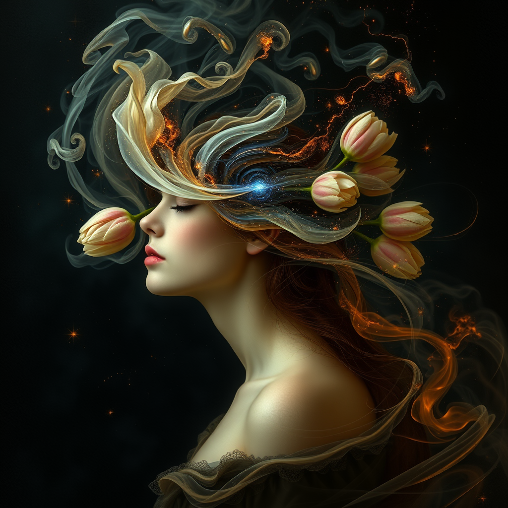 A gentle figure with tulips unfurling from her hair, surrounded by swirling galaxy smoke fractals, embodying graceful botany with fluid motion. The scene is adorned with shimmering stars and flickering lightning embers against a deep night-sky backdrop. Inspired by the romantic realism of Raphael, the dramatic chiaroscuro of Caravaggio, and the ethereal vision of Bastien Lecouffe-Deharme, the image exudes surrealism in a dreamlike, hauntingly beautiful, and moody ambiance.