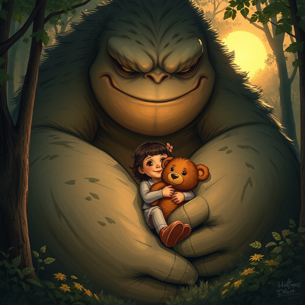 A gentle giant monster cradling a small girl in its massive arms, its eyes soft and watchful, with the sun setting behind them casting a warm glow; the girl clutches a worn-out teddy bear while smiling up at the creature, surrounded by a tranquil forest with leaves softly rustling in the breeze.