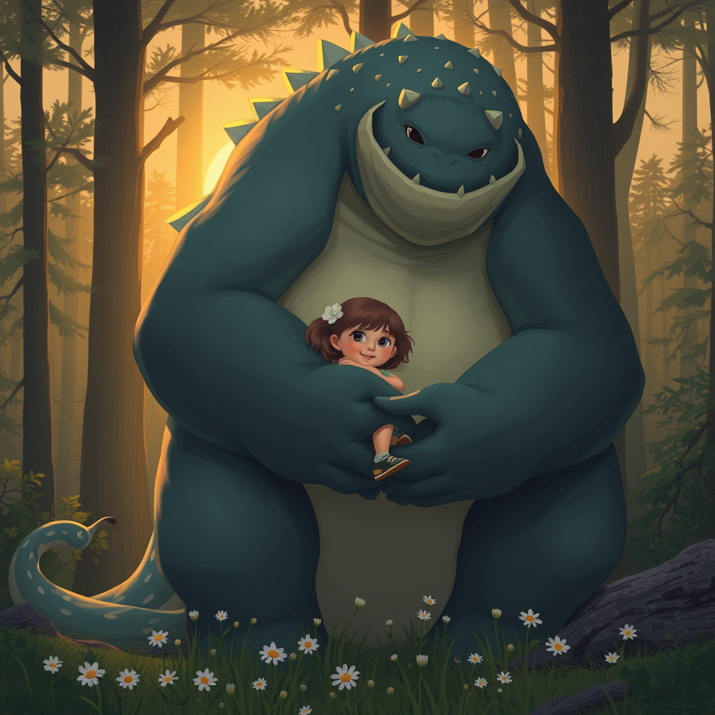 A gentle giant monster cradling a young girl in its large, protective arms, surrounded by a serene forest landscape under a golden sunset, exuding a sense of security and calm, with delicate wildflowers blooming around their feet and soft light filtering through the trees.