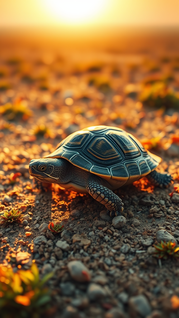 A gentle turtle slowly embarks on a journey across the vast and vibrant landscape, its shell glistening under the warm sun as it curiously explores the delicate beauty of its surroundings, each step a silent testament to its enduring patience and wisdom.