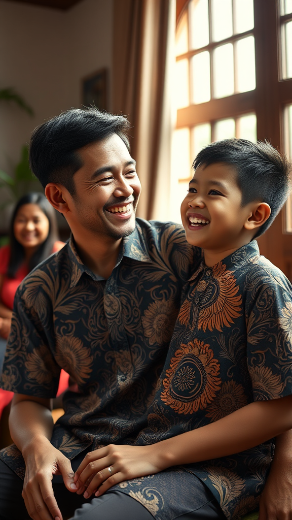 A genuine, candid moment unfolds as an Indonesian man in his 30s, dressed in an intricately detailed batik shirt, shares a warm chuckle with his young son. The vibrant energy of the traditional living room envelops the scene, with other family members visible in the background, their faces lit up with joyous smiles. Bathed in the gentle glow of natural morning light, every detail of the clothing and expressions is captured with precision, revealing a rich tapestry of familial affection. The atmosphere radiates with a palpable sense of connection and happiness, creating a vivid snapshot of family life.