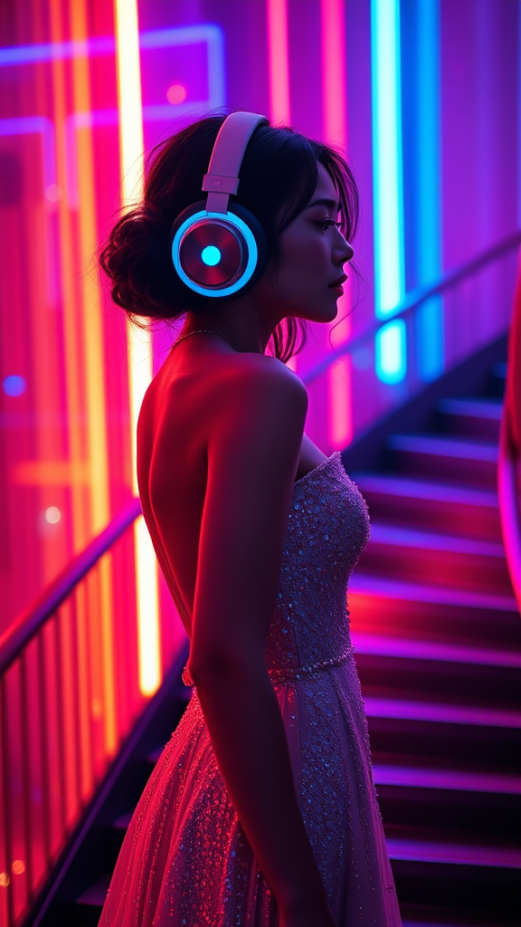 A geometrically-lit, raven-haired Asian model stands like a jewel against the strobing colours of a retro-futuristic nightclub, wearing delicate, hand-beaded abstract headphones in shades of rose and sky blue, reflected in the polished surface of a miniature, glowing sphere near her shimmering Alexander McQueen evening gown, shot from a cinematic angle down a long, spiral staircase, with streaks of Xeon-dyed neon light tracing the curves of her body as the background blurs into iridescent wafts and colliquidation effects.