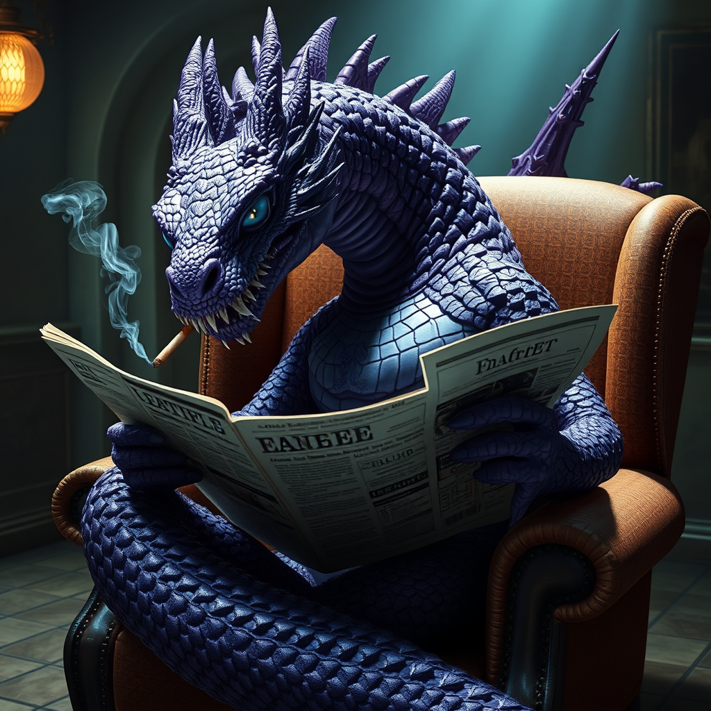 A gigantic violet dragon with menacing scales yet gentle azure eyes, its back adorned with jagged spikes, casually lounges in a vintage armchair. A thin curl of smoke spirals upward from a cigarette nestled between its fanged lips as it intently reads a futuristic newspaper. The setting is an intriguing blend of retro and sci-fi, bathed in cinematic lighting that casts dramatic shadows, emphasizing the dragon's dual nature of fearsome power and unexpected tranquility.