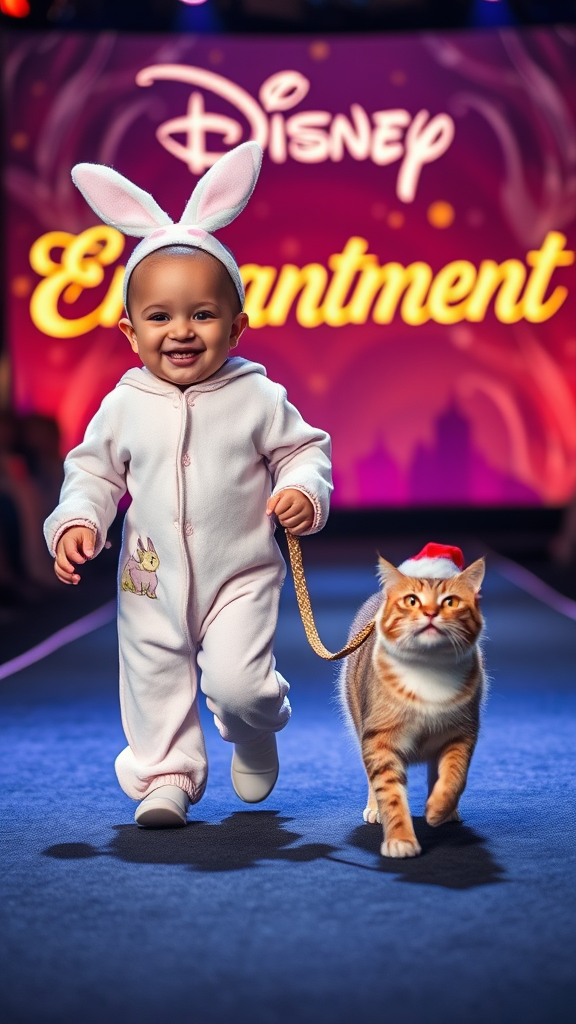 A giggling baby wearing adorable bunny pajamas toddles confidently down the runway, gently guiding a pet cat on a shimmering gold leash. The feline struts gracefully alongside, flaunting a festive Santa Claus hat perched atop its head. As they turn to make the final walk, a magical backdrop reveals a glowing sign that reads "Disney Enchantment," casting a warm glow over the enchanting scene.