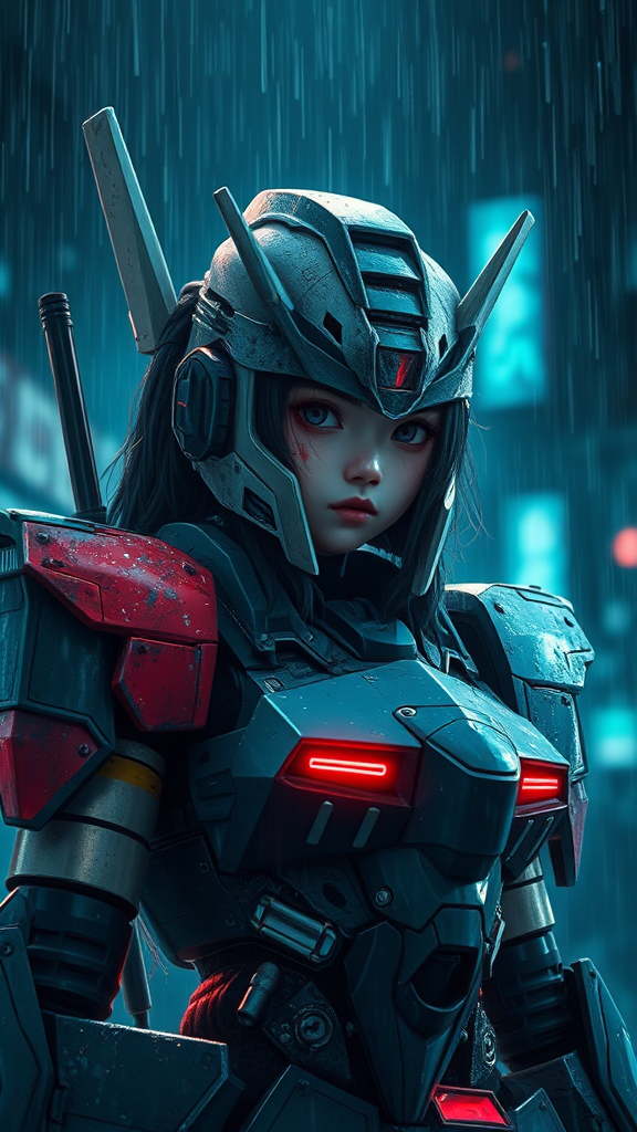 A girl adorned in battle-worn Gundam armor stands amidst a dark, rain-soaked night, embodying an epic clash scene. Her detailed face tells a story of bravery and wounds from the skirmish, with every pore and contour captured in cinematic detail. The environment around her is a stunning masterpiece, the atmosphere surreal and divine, with vivid colors and celestial reflections lighting up the gloom. This hyperrealistic scene, inspired by manga and anime aesthetics, showcases intricate details and smooth surfaces glistening under the rain. Amidst this artistic marvel, the scene evokes an ethereal sense of beauty despite the chaos, while avoiding common pitfalls like text errors, anatomical distortions, or unintentional disfigurement, ensuring a polished visual narrative free of distracting elements like watermarks or blurry aspects.