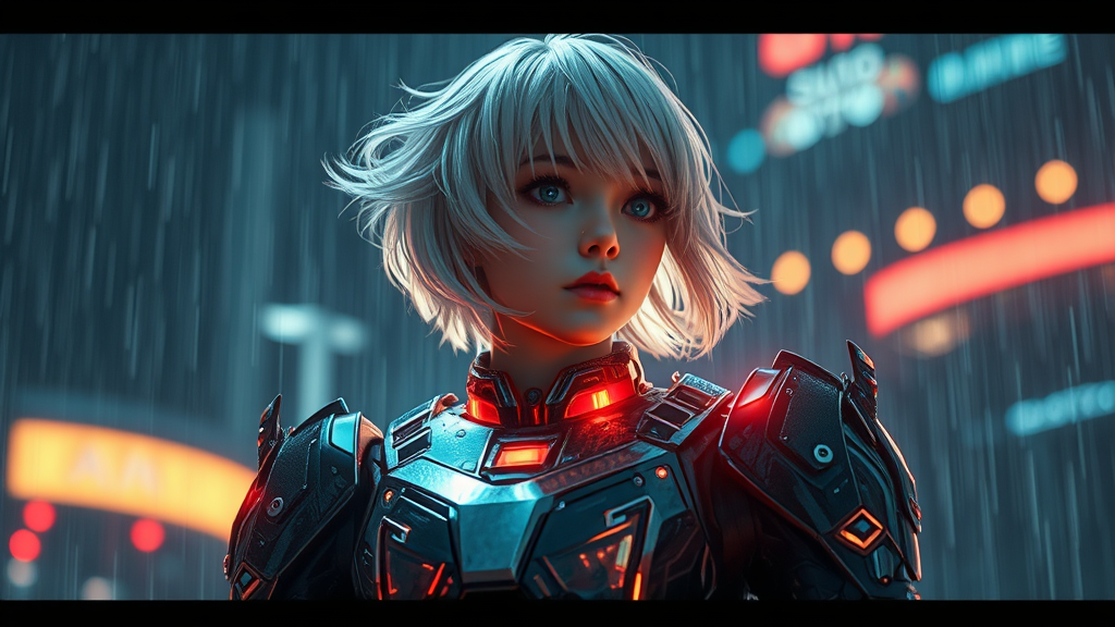 A girl adorned in futuristic mech armor stands solitary under the pouring rain of a dark, brooding night. Her short, white hair dances in the wind, exuding an ethereal and divine aura around her. The setting is a surreal masterpiece of cinematic majesty, with glowing, intricate details that resemble the finest manga and anime artistry. The environment around her shimmers with a celestial glow, enhanced by vibrant colors and atmospheric lens flares. Rendered in stunning hyperrealistic CGI, the scene captures an extraordinary level of detail, with smooth, shiny surfaces reflecting the ambient light. The photographic composition is breathtaking, showcasing a seamless blend of realistic and surreal elements. The girl, with striking focus and clarity, embodies a fusion of human and machine, her expression conveying a sense of determination and solitude. This piece is a trending masterpiece on ArtStation, exemplifying artistic finesse with cinematic lighting and intricate visuals that are both surreal and captivating.