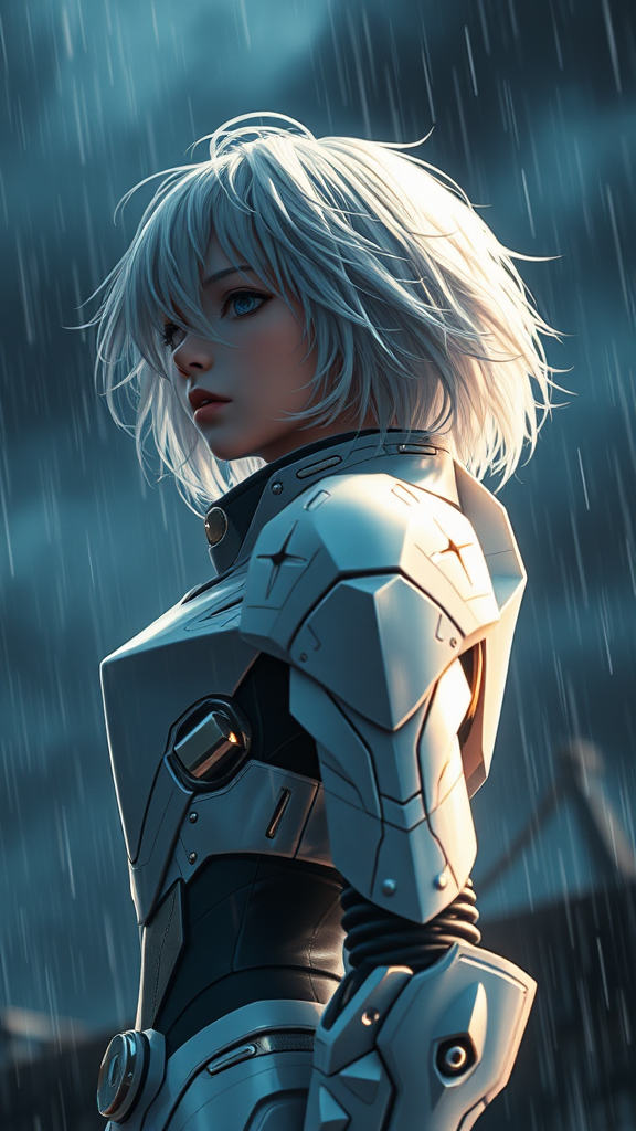 A girl adorned in sleek, futuristic armor reminiscent of Gundam, with her short white hair caught in the gusts of a stormy night. She stands solitary amidst the raindrops under a dark, expansive sky. The scene is trending on art platforms, showcasing extreme details with a cinematic flair. The environment is breathtaking, with a surreal and celestial quality, reminiscent of anime-inspired CGI. Shiny and smooth surfaces highlight the divine craftsmanship of the armor. The setting is both mystical and dramatic, captured in a photorealistic style.
