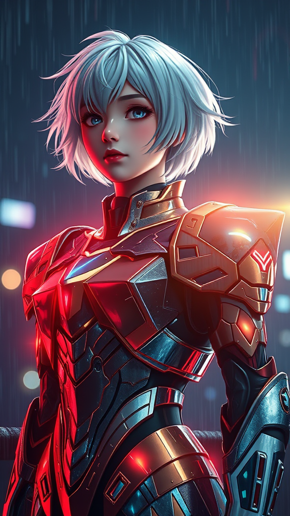 A girl adorned in sleek Gundam-inspired armor stands alone on a dark, rainy night. Her short white hair is caressed by gusts of wind, creating an ethereal scene. The environment around her is dazzling, with cinematic lighting illuminating the shiny, intricately detailed armor. The atmosphere is surreal and divine, capturing a celestial mood that merges anime and hyperrealistic CGI styles. Lens flares and vibrant colors add to the stunning composition, resulting in a photographic masterpiece that feels as if itβs rendered in Unreal Engine 5. The scene is artistically inspired, focusing on a hyperrealistic, 3D visual with octane lighting effects.
