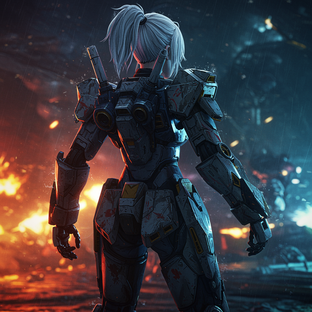 A girl clad in battle-damaged Gundam armor, her white hair pulled back into a ponytail, stands in a dark, rainy night amidst an epic fight scene. Her armor shows the signs of battle, glistening under cinematic lighting. The environment around her is stunning and surreal, filled with vibrant colors reminiscent of a celestial manga world. This intricate and hyperrealistic scene, trending on art platforms, captures a manga-inspired, anime-like atmosphere with divine and detailed artistry. The reflections and details are enhanced by Unreal Engine 5's capabilities, creating a smooth and shiny aesthetic. While capturing the essence of Borderlands' gritty style, the scene avoids imperfections, focusing on an ethereal, near-perfect representation of a cinematic masterpiece.