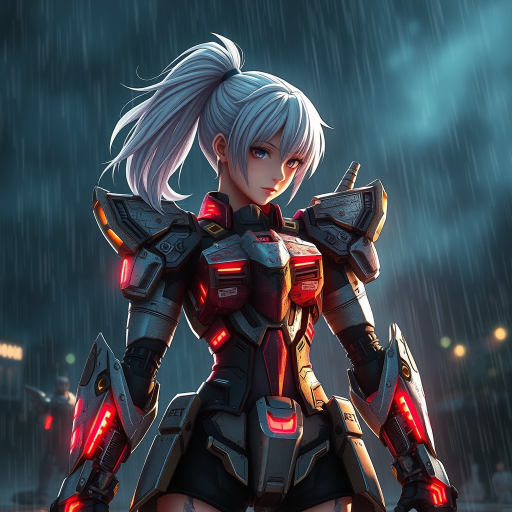 A girl clad in battle-worn Gundam armor with a shimmering white ponytail stands amidst a dark and stormy night, caught in the throes of an epic fight. Her armor shows signs of damage from intense combat, yet gleams with an otherworldly shine. Despite wounds from battle, she exudes strength and resilience. The scene captures a blend of Borderlands' stylistic edge and a hyperrealistic anime influence, showcasing extreme detail and vibrant color. Cinematic lighting highlights the intricate design of her suit, while Unreal Engine 5's Lumen reflections create a surreal, divine atmosphere. The environment is stunning, a masterpiece in its own right, with each raindrop and every reflection rendered in exquisite detail, offering a sense of both the celestial and the sublime. The scene embodies the essence of high-quality CGI rendering, avoiding any visual errors or imperfections.