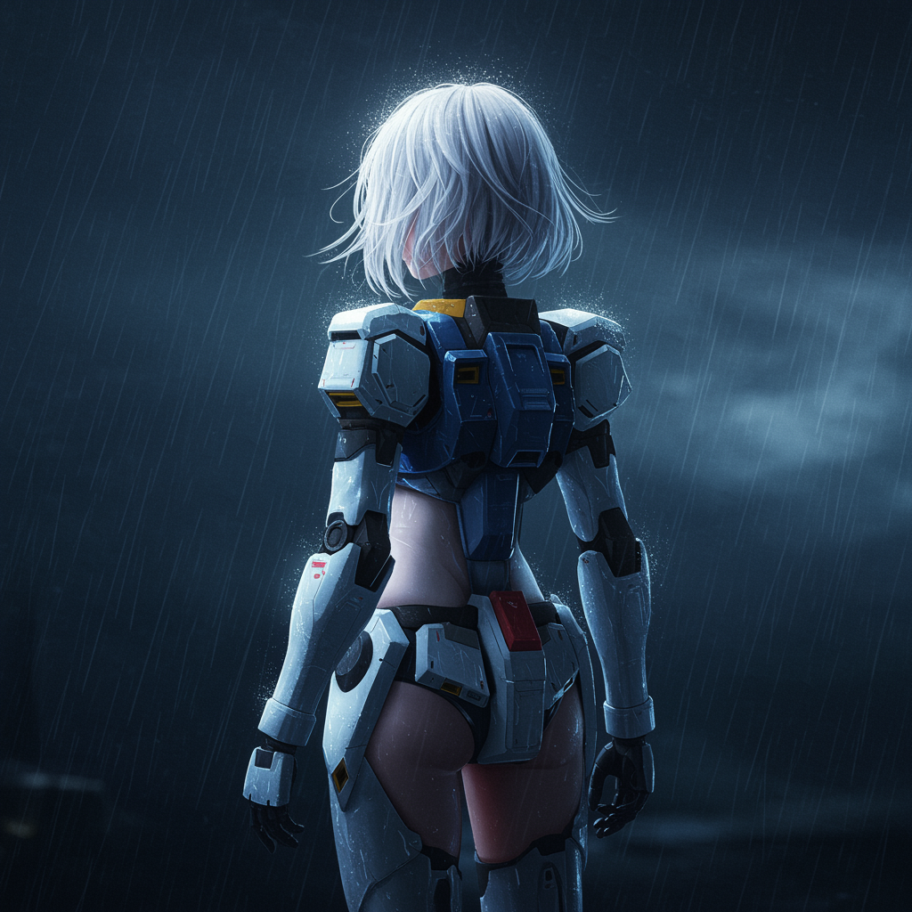 A girl clad in Gundam-inspired armor stands alone on a stormy night, her short white hair catching the gusts of wind. The scene is captured in cinematic detail, a stunning masterpiece akin to a striking work trending on art platforms. Her armor glistens under the rain, enhancing the surreal and divine atmosphere of the environment. Imagine a blend of anime and manga CGI artistry, capturing an almost celestial aura. The setting feels like a high-quality 3D render, emphasizing smooth, shiny textures that contrast beautifully with the dark, wet backdrop. Despite minor imperfections, she embodies a haunting yet mesmerizing presence, a lone figure amidst the chaos of the night.