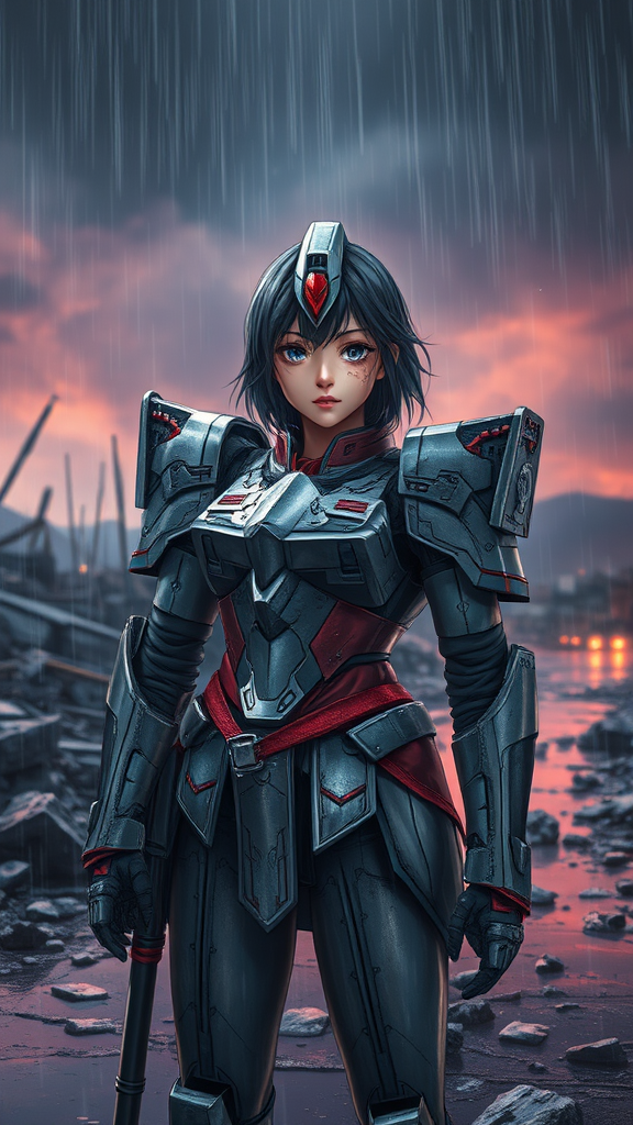 A girl clad in Gundam-inspired armor stands amid a destroyed battlefield, her armor showing signs of wear and battle damage. The rain pours down in torrents as the night sky looms heavy and dark, creating a dramatic and intense scene. She bears the scars of battle, yet her face remains expressive and intricately detailed, capturing a range of emotions. The environment around her is stunningly rendered, full of vibrant colors and illuminated by cinematic lighting that highlights her smooth, polished armor. The scene possesses a surreal and divine quality, merging celestial elements with a manga and anime aesthetic. Hyperrealistic details capture every nuance, from the reflections in the wet pavement to the contrasting shadows. Filled with energy and atmosphere, the scene avoids imperfections and remains flawless, highlighting the girl's fierce resilience and determination.