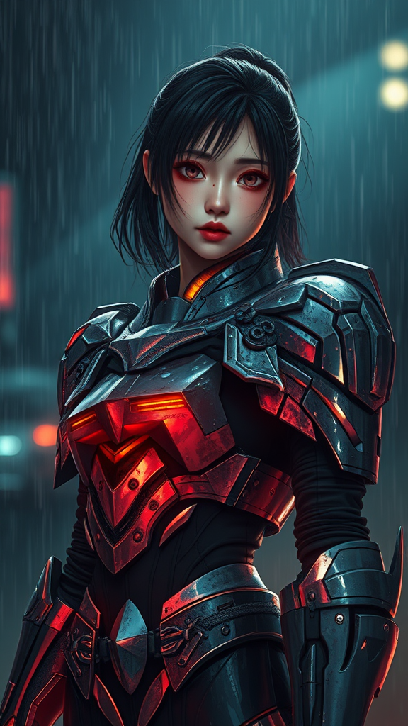 A girl clad in Gundam-inspired armor stands amidst a dark, rain-soaked night, her battle-worn armor showing signs of an epic struggle. The scene captures the drama of an intense fight, with her wounded figure defying the chaos around her. Her face is a study in exquisite detail, set against a cinematic backdrop that’s both stunning and surreal. The environment gleams with a divine, celestial quality, merging manga and anime aesthetics with an atmosphere rich in color and cinematic lighting. Hyperrealistic reflections play across the smooth, shiny surfaces of her armor, highlighting the intricate craftsmanship. The composition maintains its focus, even as it suggests complex narratives. Despite its low resolution, the depiction avoids errors like missing or extra digits and maintains an elegant frame, free of artifacts, ensuring the artistry shines through unimpeded.