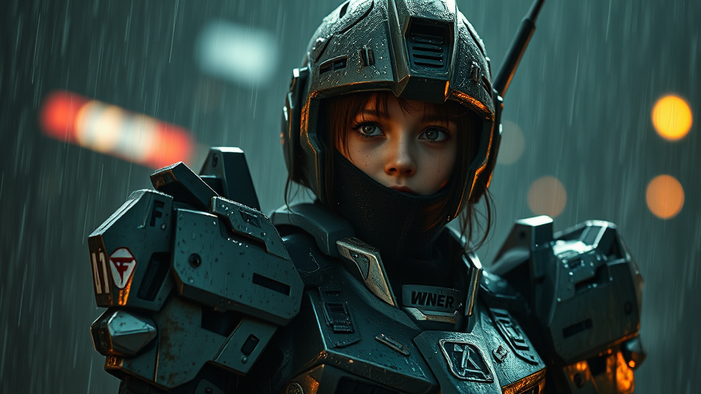 A girl clad in Gundam-inspired armor stands resilient, her battle-damaged gear reflecting the dim light of a stormy, rain-soaked night. She emerges from an epic showdown, visibly wounded yet unyielding. Her face, though marred by combat, displays intense detail and emotion, set in a dramatic and captivating scene. It's as if a cinematic masterpiece has come to life, with the photography capturing a mesmerizing environment where the rain adds shimmer to her armor. Surreal and divine, the atmosphere blends celestial manga and anime aesthetics, rich in color and intricate detail. The hyperrealistic setting is enhanced by the play of light and shadow, accentuating every reflection and detail, despite the occasional storytelling imperfections in the framing and anatomy. The scene invites you to immerse yourself in its enigmatic and captivating world.