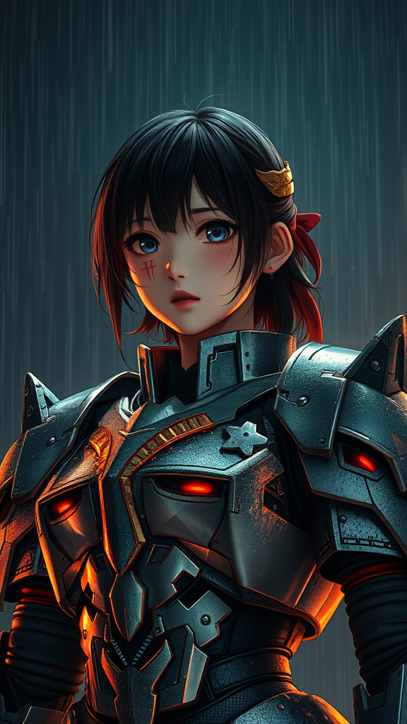 A girl clad in Gundam-inspired armor stands under the dark, rainy night sky, her battle-worn suit reflecting the chaos of an epic fight scene. The armor, glistening under the cinematic lighting, reveals intricate details of wounds and damage from the fierce clash. Her face, marked by the intensity of battle, appears detailed and hyperrealistic, capturing the soul of a warrior. The environment is stunning, with celestial and divine elements that create a surreal, atmospheric backdrop. The scene is lush with colors, the rain adding a smooth, shiny texture to the surreal imagery. While her form remains mostly intact, there are subtle anomalies in her silhouette, hinting at the fantastical elements of manga and anime. Despite the focus on high detail, the low resolution introduces slight imperfections, blending the hyperreal with the dreamlike quality of the narrative.