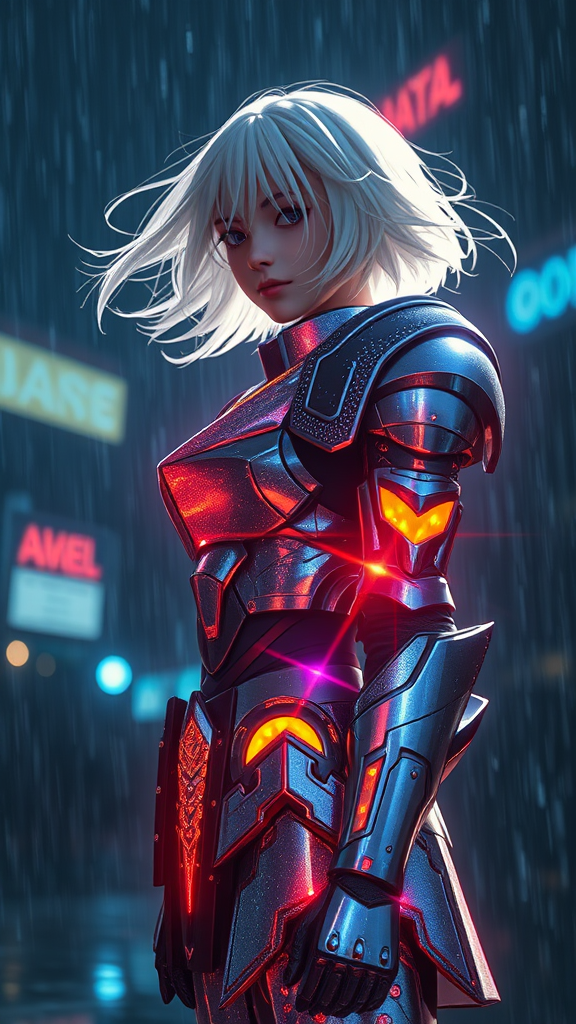A girl clad in Gundam-inspired armor stands with her short white hair flowing in the wind on a dark, rain-soaked night. She appears solitary, yet strikingly powerful, with art deco details and a cinematic presence. The environment around her glistens, capturing an ethereal and awe-inspiring quality. Her armor shines brilliantly, reflecting the surreal glow of the celestial atmosphere. The scene is vivid with a kaleidoscope of colors, enhanced by cinematic lighting, reminiscent of trending art pieces on ArtStation and rendered with the meticulous attention to detail typical of Unreal Engine 5. The setting possesses hyperrealism with intricate precision, akin to high-resolution photography. The atmosphere is accentuated with soft lens flares and radiant luminescence, bringing a sense of divine beauty and masterful artistry to the forefront.