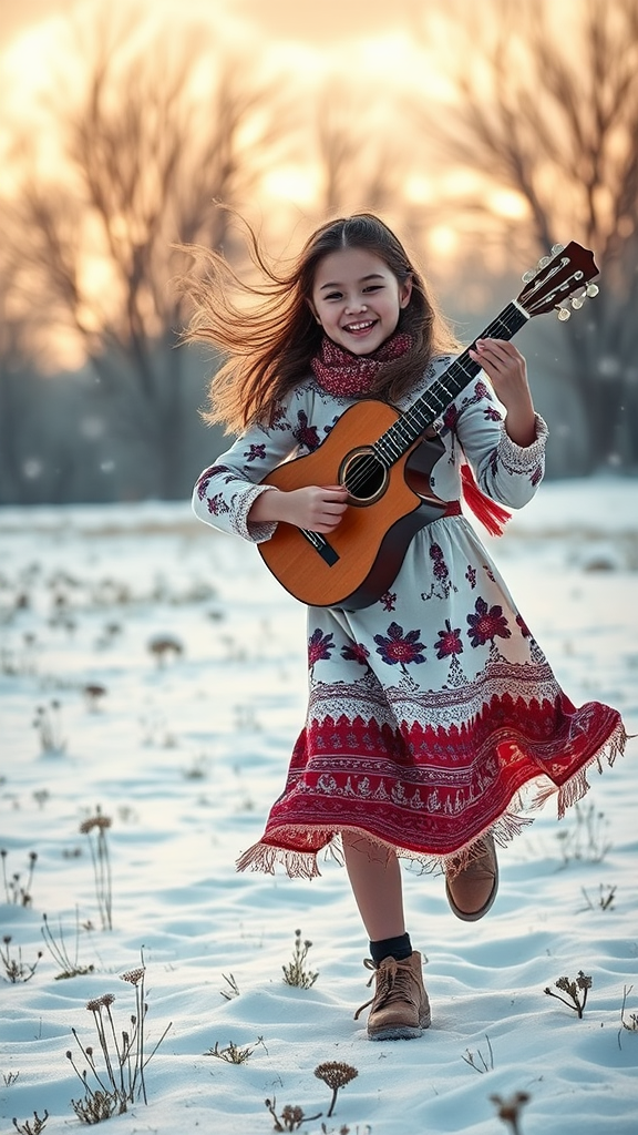 A girl dances across a snow-covered meadow, her laughter ringing through the crisp air as she plays a joyful tune on her bandura, the strings resonating with the harmony of her voice.