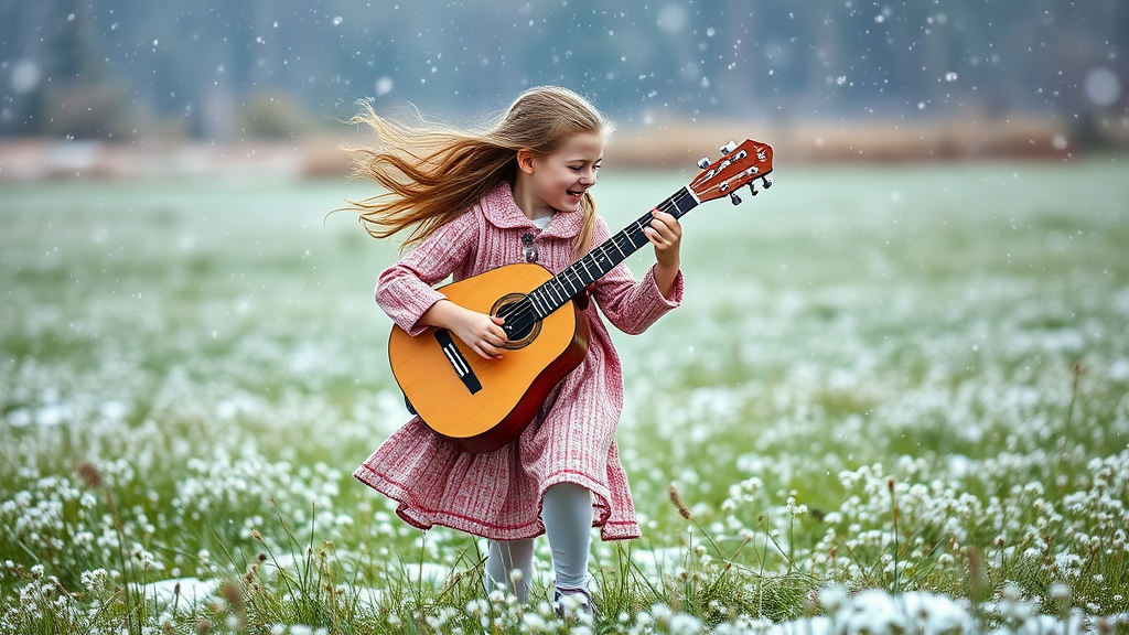A girl dances through a meadow, delighting in the falling snowflakes, her voice echoing melodious tunes as she strums the bandura, her laughter mingling with the crisp winter air.