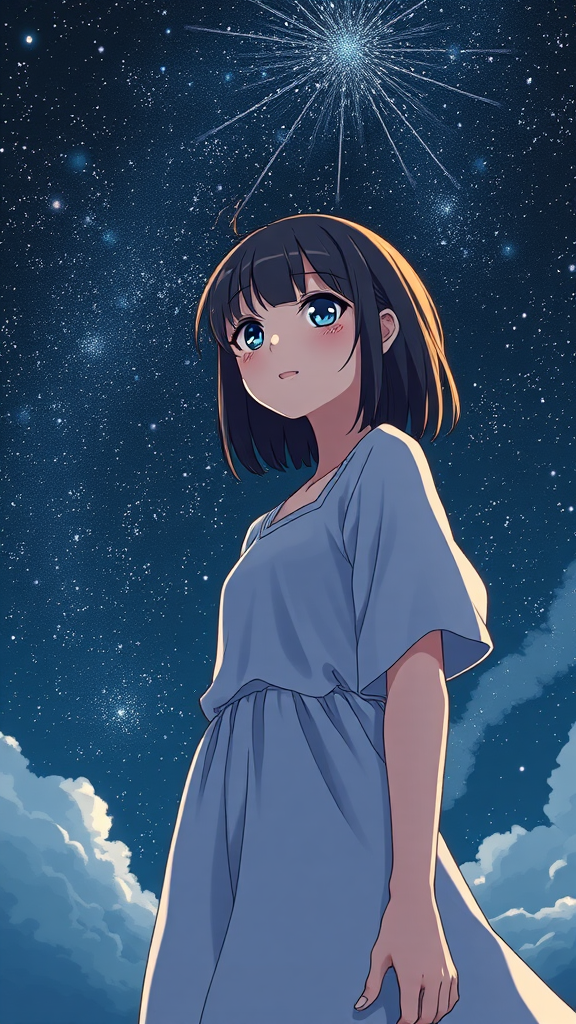A girl dressed in ethereal light clothing stands against a starry night sky, exuding a sense of satisfaction and enjoyment. Inspired by the style of artist Oyari Ashito, the scene is reminiscent of manga and anime graphics, featuring the highest quality and detail. The dark exposure of the setting is contrasted by an explosion of bright colors, highlighting her serene expression. Her eyes, full of wonder, gaze into the celestial expanse. Dark tones dominate, with the clouds subtly integrated into the background, framing her silhouette in a portrait-style composition viewed from a first-person perspective. The aspect ratio is long and elegant, adding to the scene's tranquility.