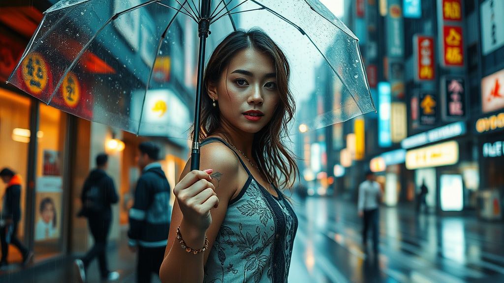 A girl elegantly dressed in stylish streetwear amidst the vibrant streets of neo Tokyo, with breathtaking beauty and intricate detailing, embodying Carne Griffiths and Conrad Roset's artistic essence. The setting is captured in 8k resolution, resembling a stunning oil painting with cinematic lighting. Rain adds a dynamic atmosphere, showcasing the scene's best quality and high resolution. The ambiance is lively yet serene, focusing on precision and vibrant tones. The girl holds an umbrella, seamlessly blending into the comprehensive cinematic landscape, exuding allure without imperfections or visual disturbances.