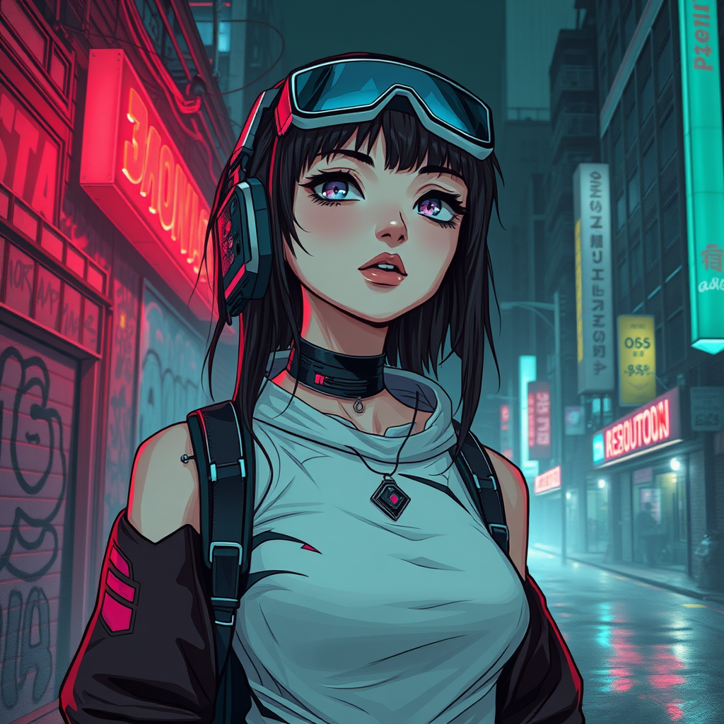 A girl from a dystopian future, embodying a futuristic design with electronic artwork influences, she appears as a manga-inspired character set in a techno-noir world. Her animated drawing features vintage futurism and pan futurism elements, set against a neon-lit urban landscape. The environment is dark and gritty, characterized by high-tech details and graffiti-covered backdrops. Surrounded by futuristic gadgets, she stands in a cinematic, intricately detailed cityscape. The scene is enveloped in moody lighting, showcasing an ultra-detailed urban environment with high-tech implants and augmented reality features enhancing her presence.
