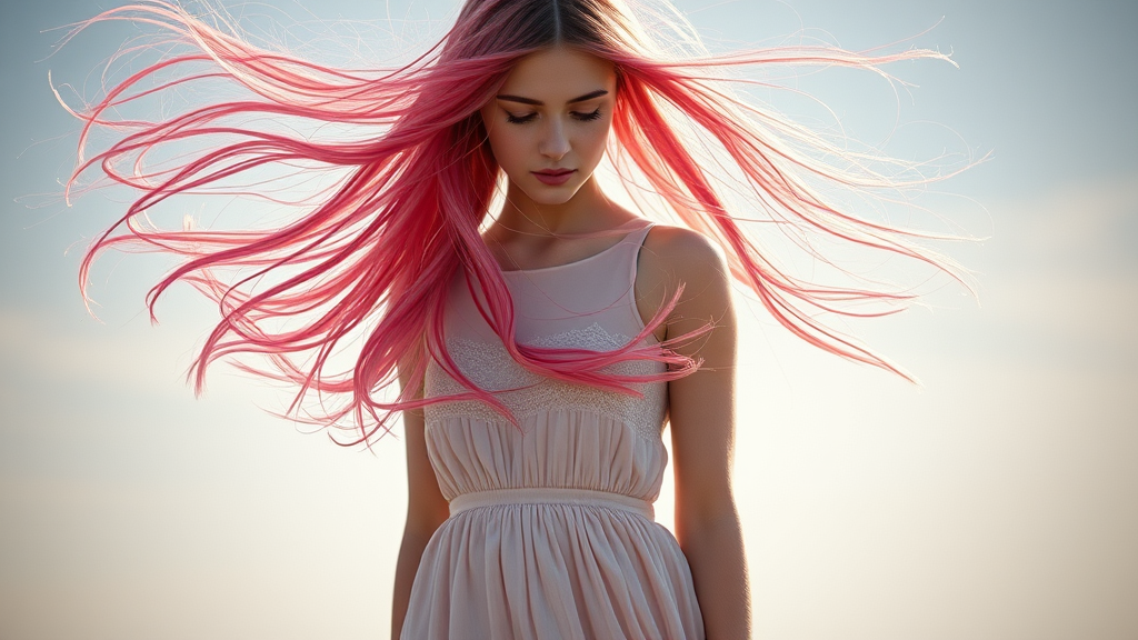 A girl in a delicate dress stands amid a strong wind, her long pink hair flowing freely. Captured with an 80mm lens, the scene features soft light yet sharp details, utilizing exposure blend techniques. The medium shot includes a gentle bokeh effect, highlighting a high contrast with lower saturation. The modelshoot style embraces dramatic lighting and a minimalist approach, showcasing flat and washed colors with subtle dithering, reminiscent of lineart. Symmetrical composition is emphasized in an octane-rendered 35mm frame, maintaining bokeh in a 9:16 aspect ratio, enriched with an hdr-like quality for a striking visual narrative.