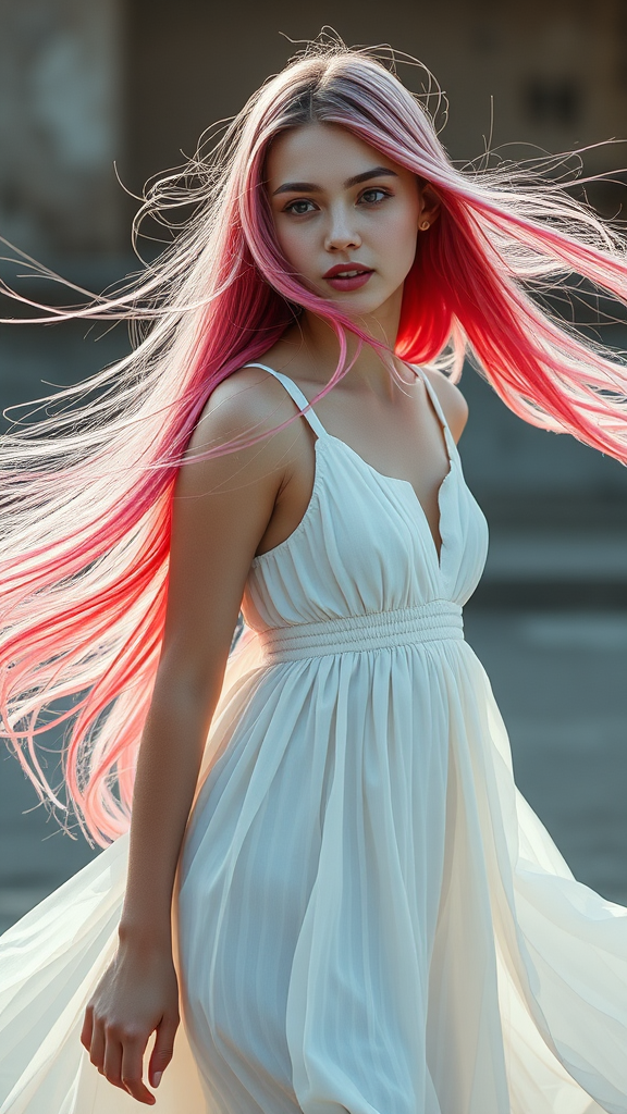 A girl in a flowing light dress stands amidst a strong breeze, her long pink hair sweeping with dramatic flair. Captured with an 80mm lens in soft light, the scene is sharp with exposure blending, offering a medium shot that emphasizes bokeh. High contrast meets low saturation, creating a model shoot style with dramatic lighting. Minimalistic and flat colors lend a washed appearance, enhanced by dithering and subtle lineart. The composition exudes symmetry and precision, using octane render techniques with a 35mm focus. The portrait framed in 9:16 aspect ratio embodies HDR elements, capturing an essence of elegant simplicity.