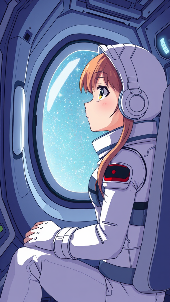 A girl in a form-fitting white spacesuit gazes thoughtfully out the window of a futuristic spaceship. The scene is illustrated in an anime and manga-inspired digital style, with a focus on dynamic colors and bold lines. Her expression shows a sense of curiosity and wonder as she observes the vastness of space. Though the art style embraces creativity, there are hints of surrealism, with exaggerated features and slightly abstracted elements that lend the image a dreamlike quality. The background depicts the starry cosmos, adding depth to the composition.