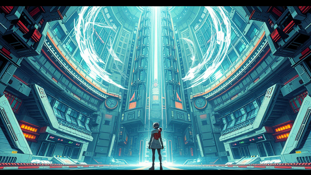 A girl in a futuristic spacesuit stands inside a colossal spaceship, inspired by Tsutomu Nihei's artistic style from Sidonia no Kishi, featuring towering multi-story structures with a hyper-detailed sci-fi aesthetic. The scene is centered around a massive laser generator, with a beam piercing down from above, surrounded by swirling energy clots. The environment is animated with a sense of acceleration and speed, captured in an anime drawing infused with manga graphics. The artwork is rendered in super-resolution 8K HD, immersing the viewer in the expansive, intricate design. The perspective is first-person, emphasizing the scale and grandeur of this futuristic setting.