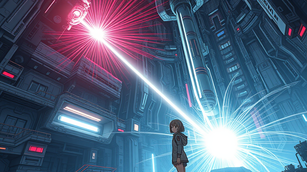 A girl in a futuristic spacesuit stands inside a vast spaceship, her eyes wide with wonder. The interior reflects the unmistakable style of Tsutomu Nihei, reminiscent of Sidonia no Kishi, with towering multi-story structures and intricate details creating a sense of gigantism. In the center, a massive laser generator hums with energy, casting a blinding flash of light that dances across the anime-inspired scene. High above, a laser beam shoots down from the sky, connecting with the generator and creating pulsating energy clots that fill the space with an aura of acceleration and speed. The setting is rendered in hyper-detailed, super-resolution graphics, blending manga aesthetics with 8K HD clarity, immersing the viewer in a world where sci-fi elements come alive, captured from a dynamic first-person perspective.