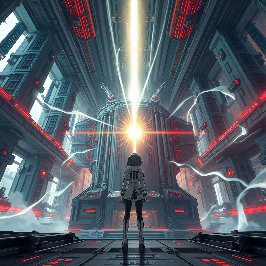 A girl in a futuristic spacesuit stands inside an expansive spaceship, inspired by Tsutomu Nihei’s distinctive style from Sidonia no Kishi. The environment exhibits towering multi-story structures, characterized by their sci-fi, hyper-detailed aesthetic. A massive laser generator dominates the scene, positioned centrally with beams extending skyward, creating an intense focal point of energy. This is surrounded by swirling energy clots, signaling acceleration and speed. A brilliant light flash enhances the dynamic atmosphere, capturing a sense of rapid movement. The setting combines anime and manga graphics, rendered in 8K, HD, super-resolution, offering an immersive first-person perspective into this imaginative space world.