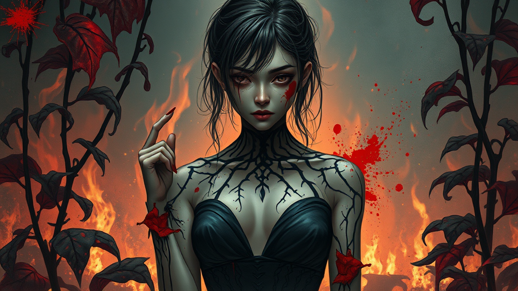 A girl in a high-cut dress stands amidst predatory plants, her black veins visible beneath her skin like intricate patterns. Oil drips from her fingertips, intertwining with ivy creeping around her form. Her face is somber yet captivating, framed by the shadows of a gloomy atmosphere. Red splashes and smudges add intensity to the scene, contrasting against the fiery background. This fine art illustration is adorned with 8K details, enhanced by rim lighting and cinematic artificial lighting that emphasize the drama and depth of the composition.
