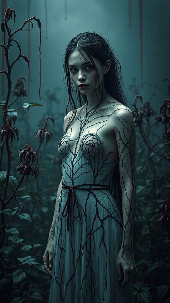 A girl in a high-cut dress with black veins intertwined across her skin, as if dripping with oil, stands amidst predatory plants and tangles of ivy. Her face is both ethereal and eerie, set against a gloomy backdrop with splashes and smudges of red bleeding into the scene. The setting is an oily, dripping landscape, with artistic illumination in 8K detail, where rim lighting and artificial cinematic lighting enhance the haunting atmosphere.