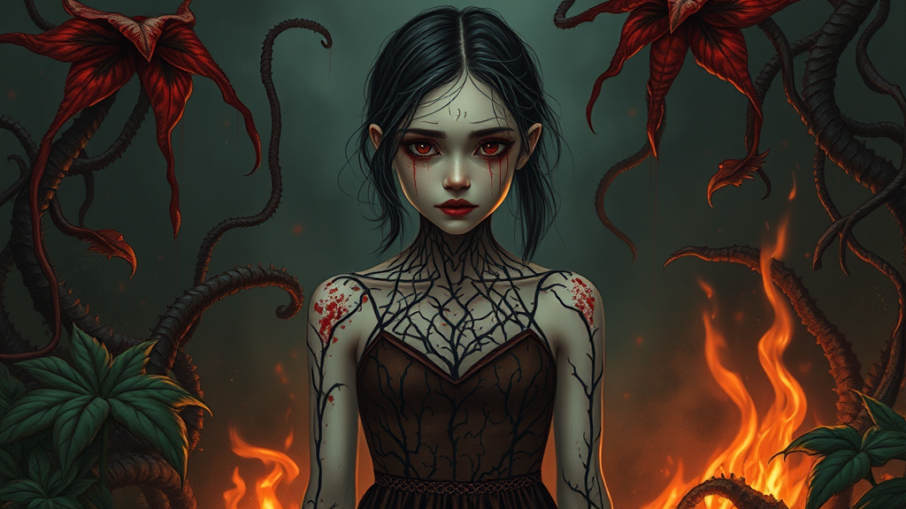 A girl in a high-cut dress with intricate black veins weaving across her skin, as if dripping with oil, stands amidst a surreal landscape of predatory plants entwined with twisting ivy. Her face, marked with an enigmatic expression, is shrouded in a gloomy atmosphere, with vivid red splashes and smudges creating a stark contrast against a backdrop of flickering fire. Illustrated in fine art style, the scene is captured in 8K resolution, using a blend of rim lighting and artificial lighting to enhance its dramatic cinematic quality.