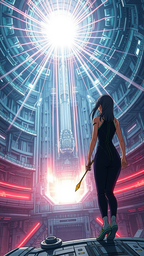 A girl in a sleek, form-fitting jumpsuit navigates the interior of a colossal spaceship, reminiscent of Tsutomu Nihei’s distinct artistry. The setting, inspired by Sidonia no Kishi, showcases towering multi-level spaces. In the center stands a massive laser generator, radiating energy clots that accelerate into a blinding light flash. The futuristic design is captured in hyper-detailed, manga-style graphics, highlighting the dizzying speed and scale. Beams of laser light stream down, interacting with the sprawling architecture. The scene is drawn in the anime tradition, presented in 8K HD super-resolution, capturing the intricate, first-person perspective of this dynamic, vibrant world.