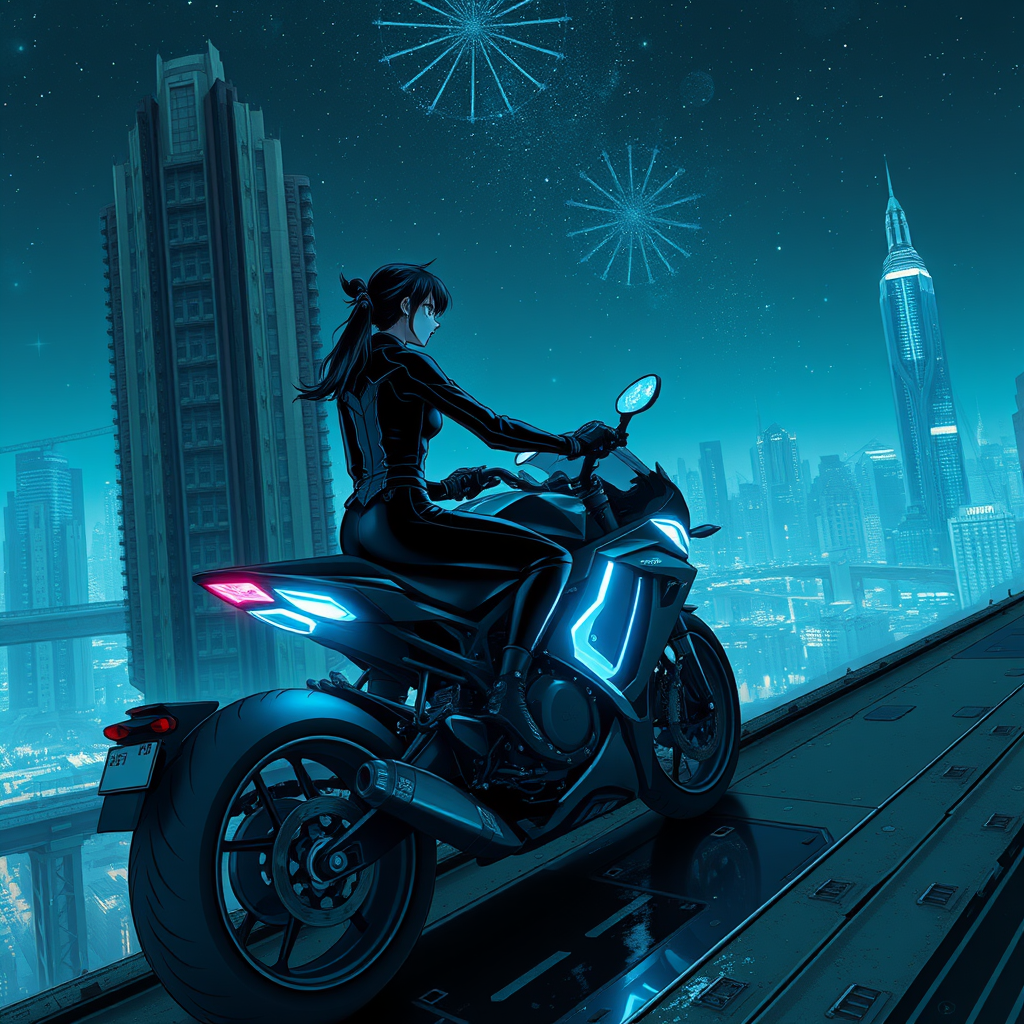 A girl in a sleek, form-fitting sci-fi jumpsuit rides a futuristic motorcycle across a towering bridge, set against a backdrop of a desolate sci-fi city with looming, dilapidated skyscrapers. The atmosphere is dark and atmospheric, drawing inspiration from Akira and the intricate, expansive style of Tsutomu Nihei. Echoes of ABARA's gigantism and multistory architecture permeate the scene. The motorcycle is neon-lit, casting vivid blue plumes of energy, with a captivating glow that cuts through the starry night. The manga-inspired graphics are rich in detail, with dark exposure emphasizing the contrast. A dynamic fusion of high quality and fully detailed anime art renders the scene in deep blue tones, offering an immersive, first-person perspective. The image is rendered in stunning 8K Full-HD resolution, where every nuance of texture and light is captured in a futuristic, plasma-infused visual masterpiece.