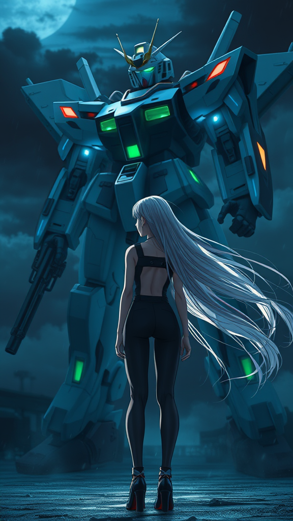 A girl in a sleek jumpsuit stands before a towering Gundam, her long white hair flows with the night wind. It's a dark, stormy evening, and she is alone in this dramatic scene. The environment is rendered with cinematic detail, showcasing a stunning, surreal setting. The atmosphere is divine and celestial, blending manga CGI with 3D artistry. The imagery is a masterpiece with smooth, shiny textures. Despite the low resolution and text errors, the scene evokes a sense of awe. The girl's proportions are perfect, and the focus remains sharp, capturing the essence of this moment.