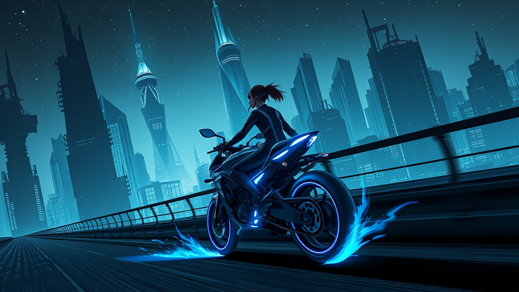 A girl in a sleek sci-fi jumpsuit rides a futuristic motorcycle across a sprawling bridge, silhouetted against the remnants of a towering sci-fi metropolis adorned with towering skyscrapers. The setting is enveloped in darkness, reminiscent of Akira and Tsutomu Nihei's ABARA, showcasing elements of gigantism and sprawling multi-level spaces. The motorcycle, glowing with neon-blue accents, cuts through the starry night, casting luminescent blue energy plumes. The scene captures the essence of highly detailed and stylized manga graphics, with a focus on dark exposure and ethereal blue tones. The first-person perspective enhances the sense of velocity and immersion, conveying a cinematic and vivid 8K Full-HD experience, enriched with plasma-like effects and futuristic design elements.
