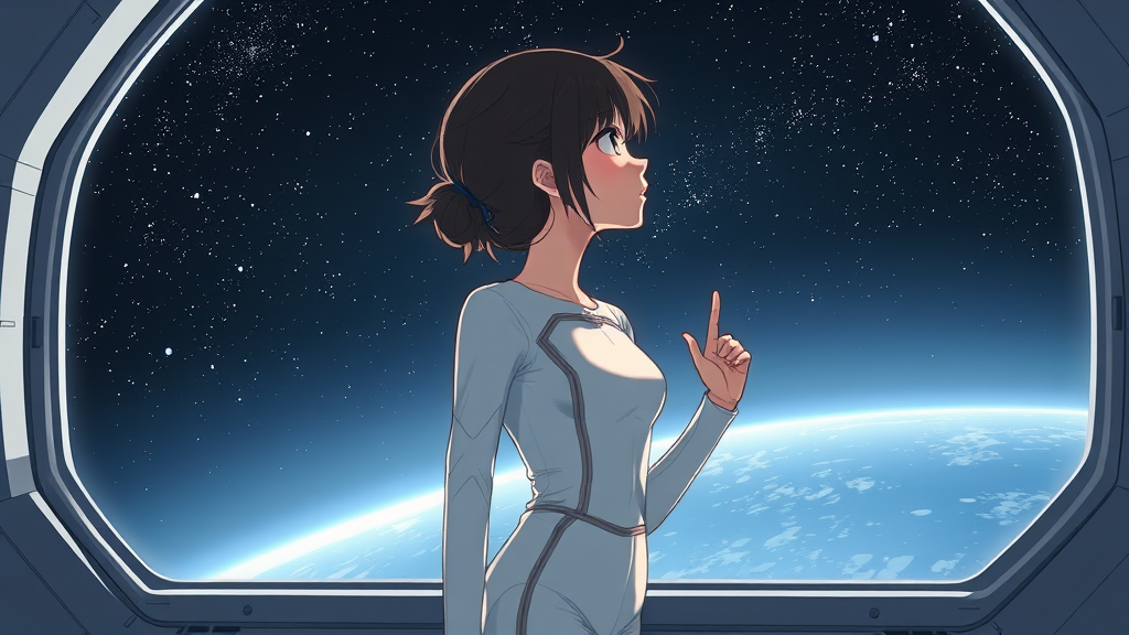 A girl in a sleek white jumpsuit gazing out the window of a spaceship, anime, manga style, digital art. The scene captures a sense of wonder and curiosity as she looks into the vast expanse of space. She stands with a poised posture, her expression contemplative. The artwork emphasizes the beauty of solitude in space, using soft colors and subtle shading to create a serene atmosphere. The jumpsuit's details are intricate yet understated, hugging her form gracefully. Her hair is styled simply, accentuating her focused gaze. The spaceship window is large, offering a panoramic view of the stars, with the girl almost silhouetted by the celestial light. Shadows play gently across her face, giving depth to her features. There are subtle imperfections that add a touch of realism, with natural hand positions and proportions consistent with the overall delicate theme. Her fingers rest lightly on the glass, conveying a sense of longing and adventure.