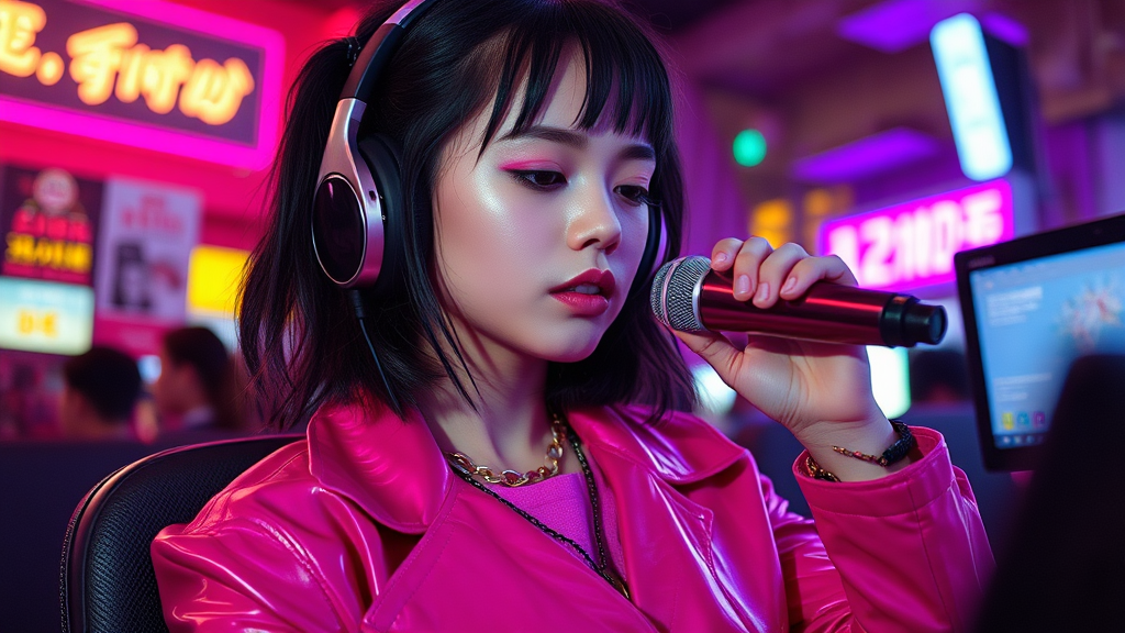 A girl in a vibrant pink shirt and pink jacket is immersed in music, depicted in a style reminiscent of liquid metal with deconstructed tailoring. The scene captures the essence of webcam photography infused with duckcore elements, featuring bold curves and a chinapunk aesthetic. The image mirrors the stark, high-contrast qualities of Ferrania P30 film with an aspect ratio of 65:87, embodying a raw, unconventional style and exuding an edgy, futuristic vibe.